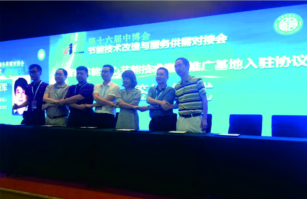 公司董事長陳程(左二)在第十六屆中博會節(jié)能技術(shù)改造與服務(wù)供需對接會上簽約留影